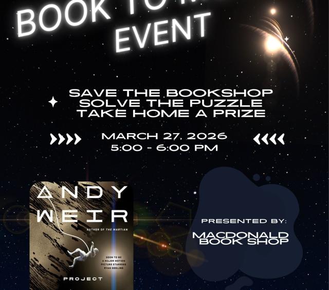 Macdonald Book Shop's next book to movie event is Project Hail Mary. Our shop will host an hour long event with a book to movie discussion, mocktail, and interactive activities. Please join us for this entertaining event at the book shop. Please RSVP to help us plan the event accordingly.