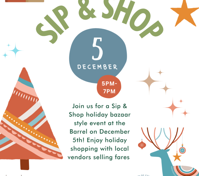 Join us for a Sip & Shop holiday bazaar style event at the Barrel on December 5th! Enjoy holiday shopping with local vendors selling fares.