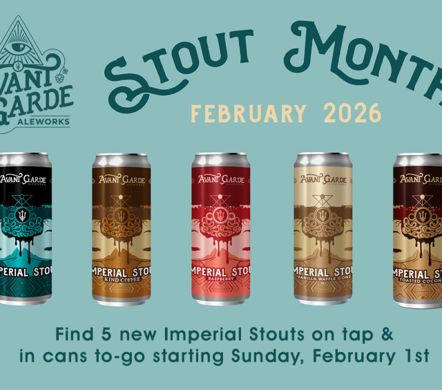 February is Stout Month at Avant Garde Aleworks! Find five new Imperial Stouts on tap and in cans to-go throughout the month, with a new release every Saturday. Plus, check out the fun events we’ll be hosting throughout the month to keep the Stout Month party going. These beers usually don’t last all month long so don’t miss your chance to try all of our 2026 flavors!