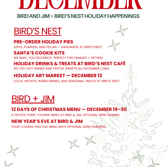 At Bird and Jim we are defining Colorado cuisine with our ever evolving seasonal and ingredient driven menus sourced from the Front Range of Colorado and beyond. Our menus are influenced by our artisan approach to cooking, the ardent nature of our neighbors, and the farms from which we source. Chef Ethan’s cooking philosophy revolves around local, sustainable and healthy eating. To provide this experience the Chef and team proudly source from local farms and businesses such as Black Cat Farm, Tooey and Sons Organic Farm, Red Wagon Farm, Hazel Dell Mushroom, Jodar Farm, Wisdom Natural Poultry, Kind Coffee, Cinnamons Bakery, Scratch Bakery, and House of Smoke game meats.